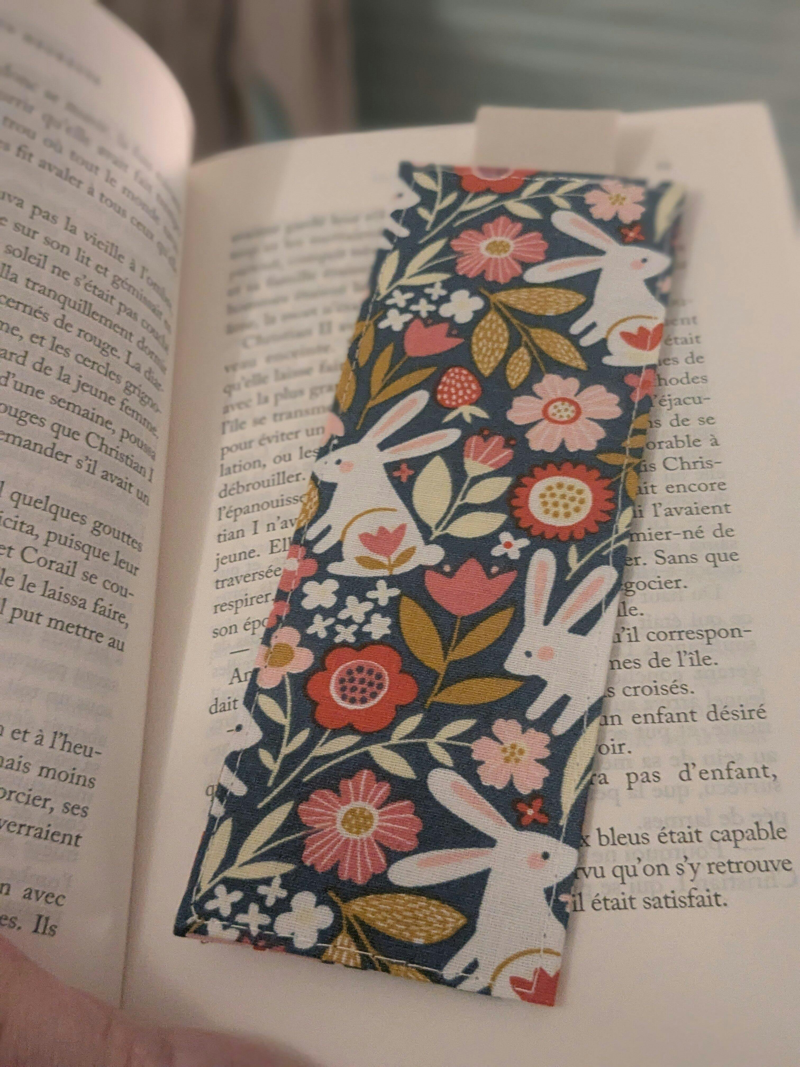 Marque-page en tissu, rigidifié et cousu main par mes soins.